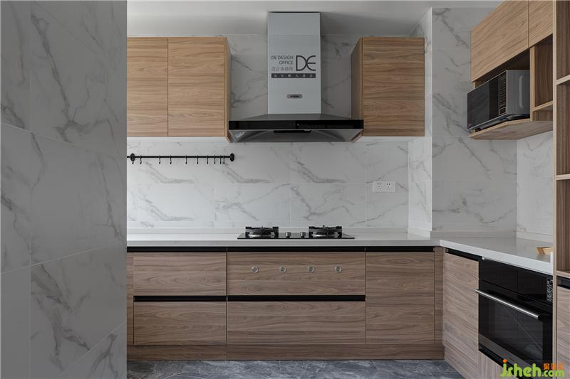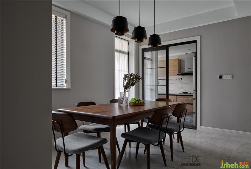 復(fù)古原木色的餐桌搭配深色的吊燈讓空間迅速沉穩(wěn)下來(lái),黑色邊框玻璃滑門(mén)讓擴(kuò)大之后的廚房顯得更加通透,空間中的黑色線條搭配自然系木紋的櫥柜柜門(mén),讓現(xiàn)代簡(jiǎn)約的空間又增添了一份時(shí)尚感 。