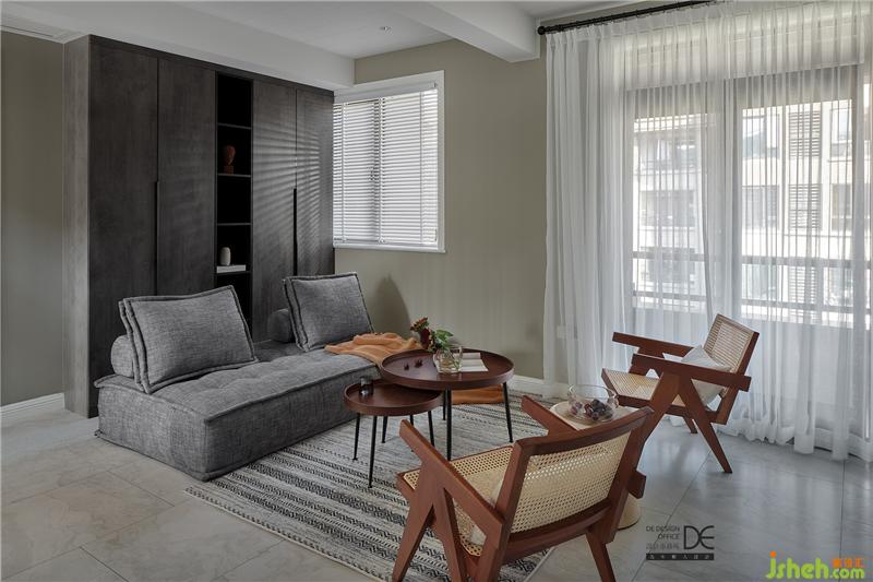采用和客廳同色系的布藝沙發(fā),使得空間連貫有序、簡(jiǎn)潔大方,藤編的休閑椅和高低錯(cuò)落的邊幾,增添了幾分空間層次感和趣味性。