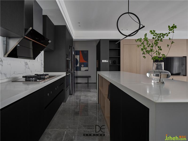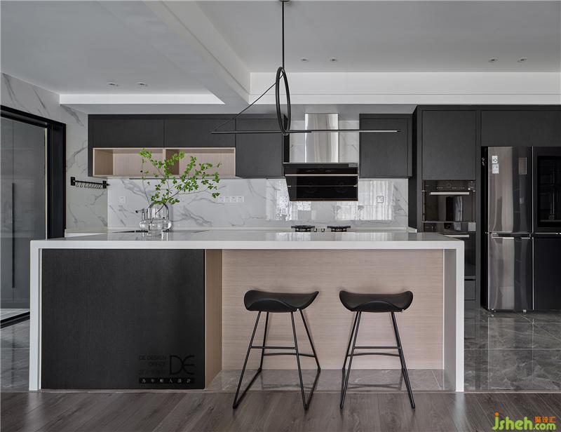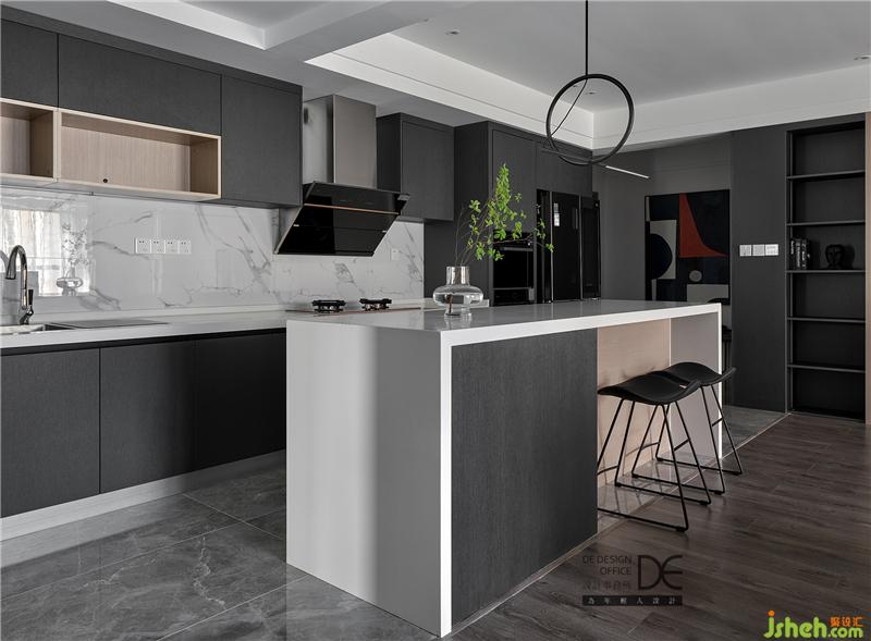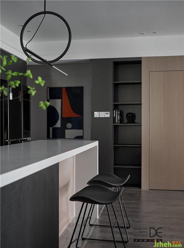 整個廚房以黑白為主,以木色為點綴和其他空間形成呼應(yīng)。把原有的廚房空間和餐廳空間打通做成大的開放式廚房,讓做飯有了交互性。下廚時,和客廳的家人一起聊聊今天發(fā)生的趣事,也讓家人之間多一些溝通和了解,增進感情。