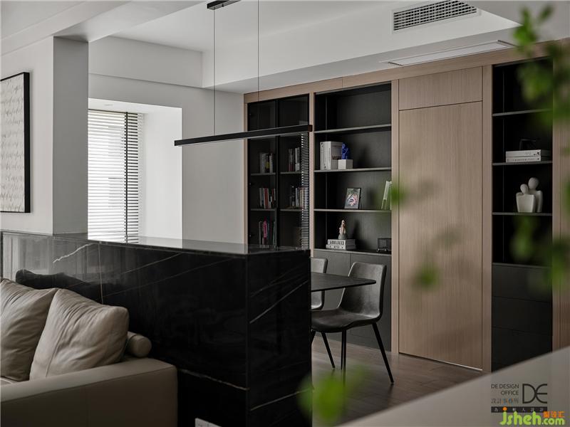 把靠客廳的一個次臥整個打通,讓餐廳、書房區(qū)域和客廳變成一個通透的大空間。沙發(fā)背后除開承重墻部分保留,其余部分打半高墻處理,以黑色石材飾面。客餐廳區(qū)域形成的這種橫廳似的感覺,讓整個空間的采光面變得更大了。