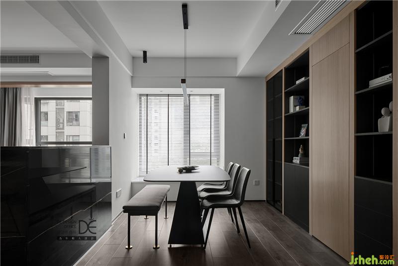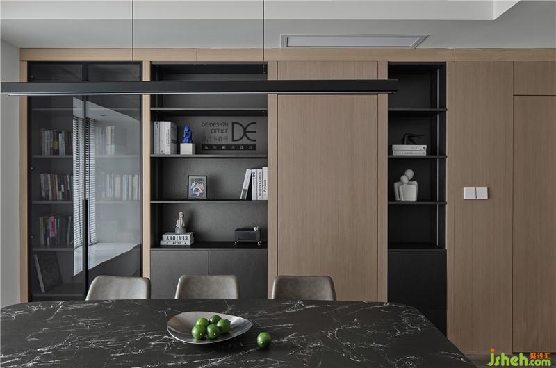 把原始次臥改為餐廳兼書房,可以聚餐、畫畫、練字、看書等,算得上是一個多功能區(qū)域。黑色石材和黑色巖板餐桌呼應(yīng),加上黑色的開口書架,從色系上形成統(tǒng)一。落地臺燈柔和的光,搭配上百葉窗透出的一絲絲光線,不自覺地讓人放松下來。