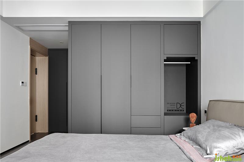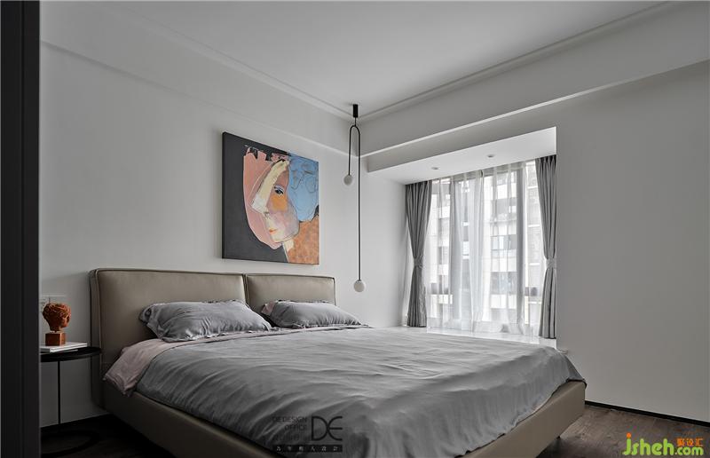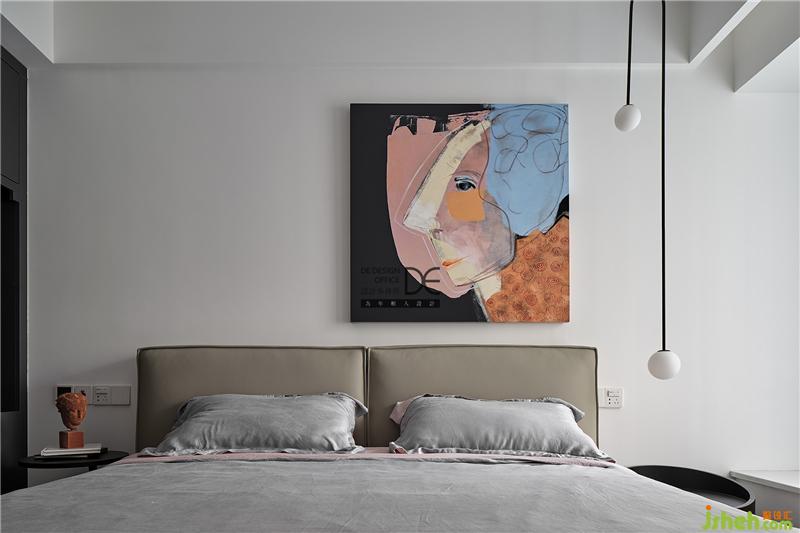 在顏色豐富的藝術(shù)裝飾畫(huà)和深灰色柜子的碰撞下,讓走進(jìn)主臥的人眼前瞬間一亮,干凈清爽的床頭和藝術(shù)畫(huà)、吊燈完美地融合在一起,讓空間張弛有度。