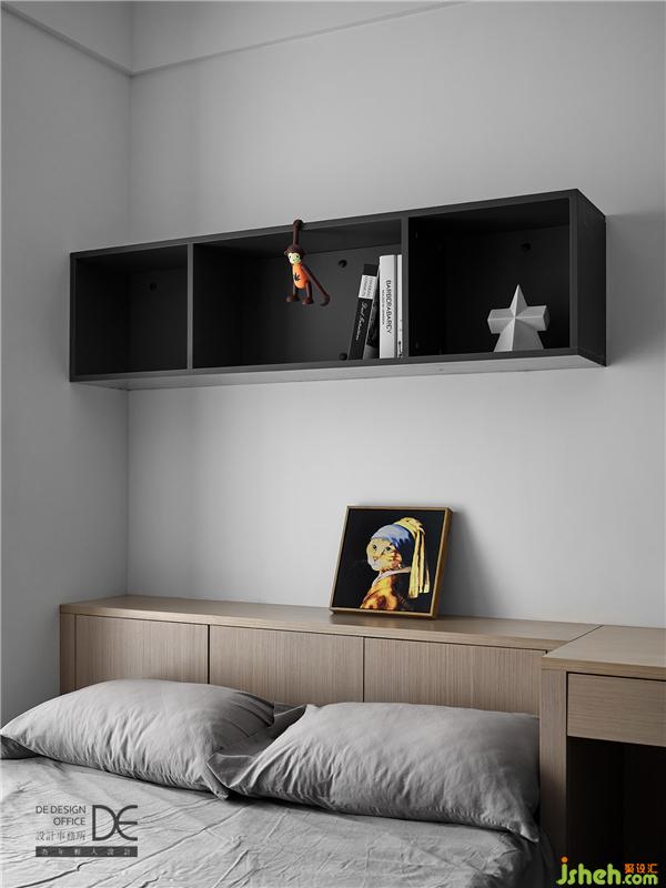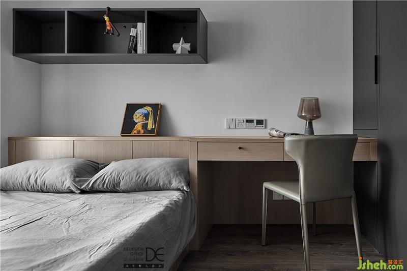 次臥白色打底,木色和深灰色碰撞。以榻榻米的形式設(shè)計(jì)整個(gè)次臥,床頭靠背和書(shū)桌形成一個(gè)整體,讓空間更有延展性。