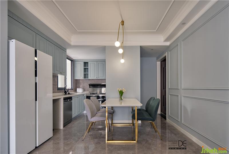 L型廚房操作臺面節(jié)約空間,大理石花紋地磚配上墻面線條造型讓空間更具層次,同時拉伸視覺效果。金屬燈具、餐椅的加入,讓空間更顯質(zhì)感。