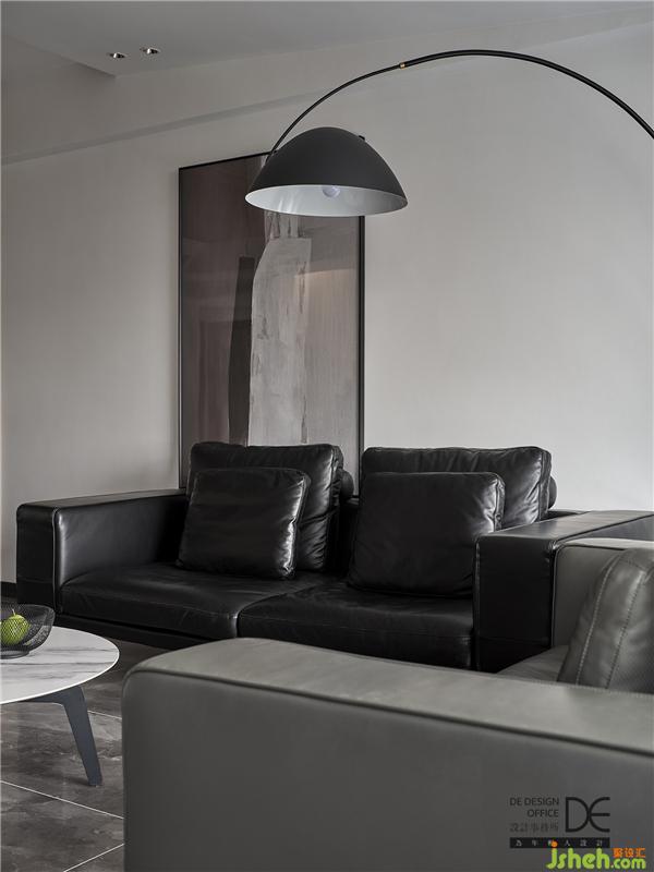 客廳斜頂?shù)脑煨腿趸撕涂蛷d與陽臺之間梁的高度,同時漫反射光源的加入讓整個客廳頂面錯落有致。