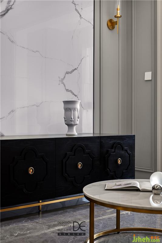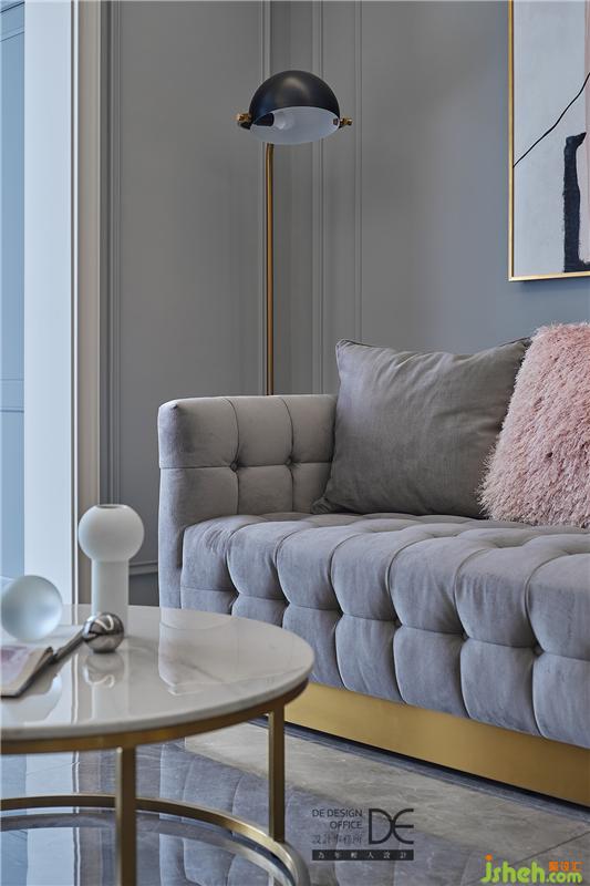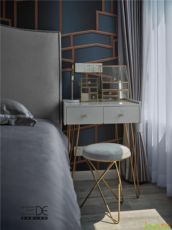藍(lán)色、灰色、金色,將輕奢感精妙地植入進(jìn)空間,從而側(cè)面表現(xiàn)業(yè)主對輕奢的喜好。