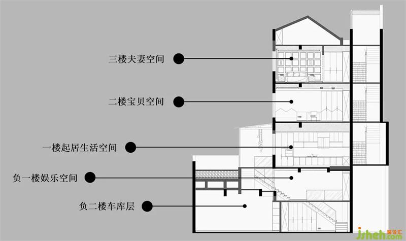 2) 原始車庫層的挑空高度為5280mm,現(xiàn)澆出隔樓,分別用于室內(nèi)車庫以及娛樂區(qū),并將花園下夾層做成儲物空間,同時(shí)利用負(fù)一樓樓梯間實(shí)現(xiàn)樓下兩層的自然采光;