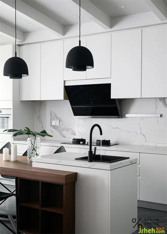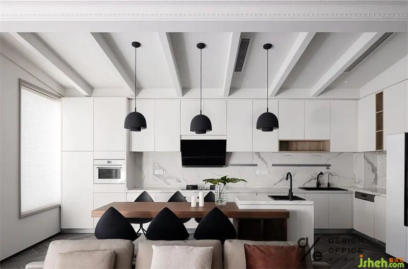 餐廳層高采用了假梁的處理方式,既保證了客餐廳的高度,又讓廚房定制的柜體與頂面無縫銜接起來。