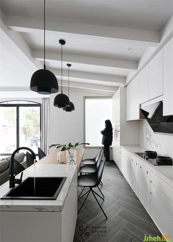 重慶別墅裝飾把客廳、開放式廚房整合到一個(gè)視覺空間里面,各個(gè)空間形成整體感又拉近了動線,給予餐廳空間更多的可能性。