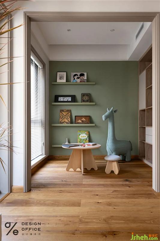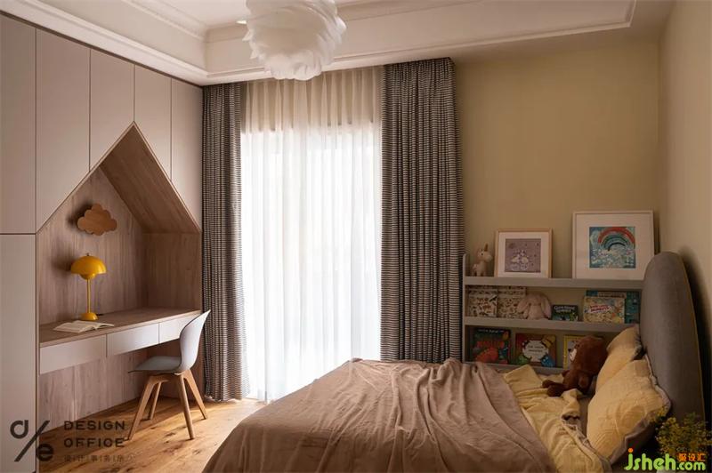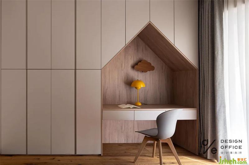將書桌與衣柜相結(jié)合,采用小房子的元素造型,增添空間趣味性,更為小朋友構(gòu)建一個藝術(shù)感、趣味性、啟發(fā)性的獨立空間。床邊隨手可拿的繪本,讓寶寶每天都酣睡在夢幻的睡前故事中,幻想著自己的小小世界。