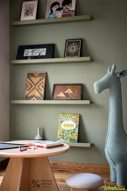 玩耍區(qū)與樓梯、過道互借空間后,整個空間都顯得比較通透,置物隔板選擇了與墻面乳膠漆顏色同一色系,更顯簡約和諧。重慶別墅裝飾通過對空間與色塊的巧妙應(yīng)用,營造出充滿未知與想象力的兒童世界。