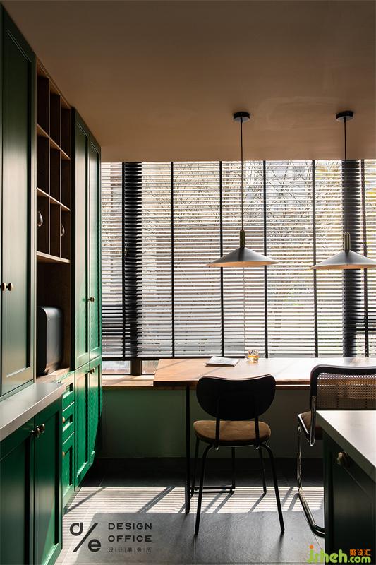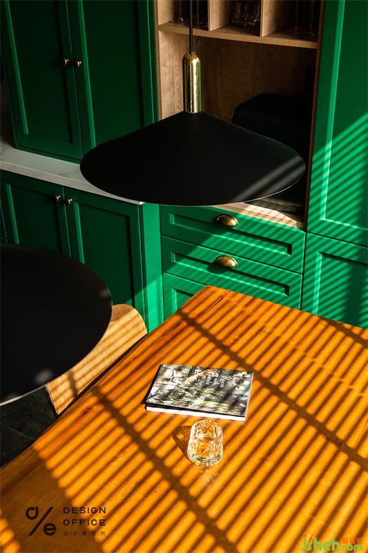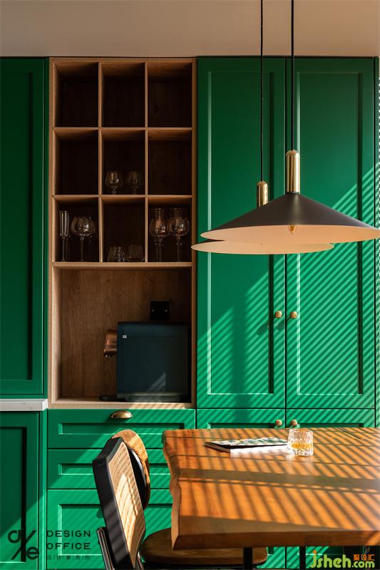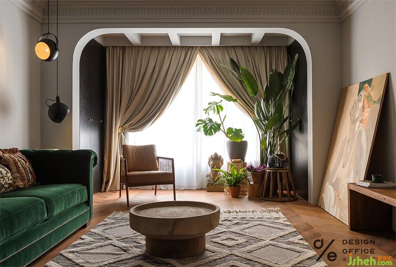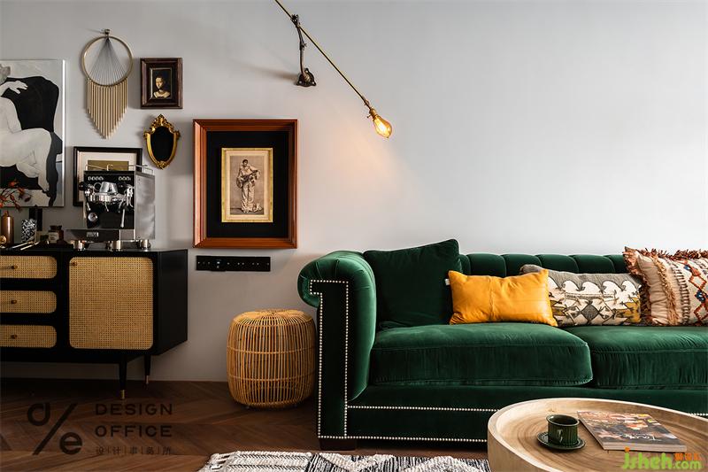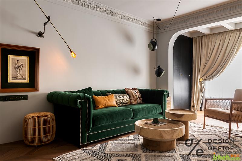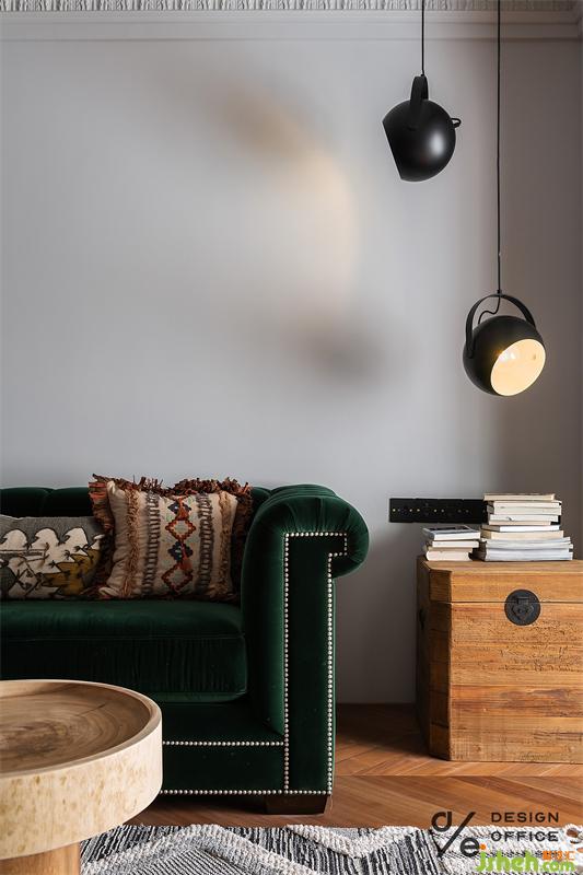 為配合空間整體色系搭配,起居室特地選用了絲絨質(zhì)地的墨綠色沙發(fā),流露出矜貴優(yōu)雅的浪漫氣息;大地色與氣質(zhì)的墨綠色搭配,巨大的色彩反差,形成了強烈的視覺印象;而將清新的木質(zhì)藤編座椅輔以金屬燈具混搭融入其中,又把色彩熱烈的碰撞拉回平衡舒適的境地。