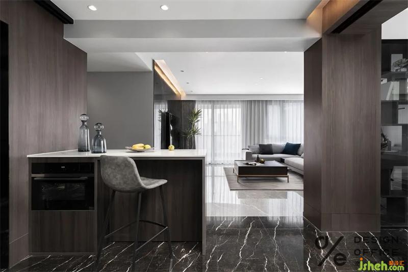 開放式廚房與餐廳相鄰,設(shè)計(jì)師以簡約布置勾勒現(xiàn)代精致的生活情景。