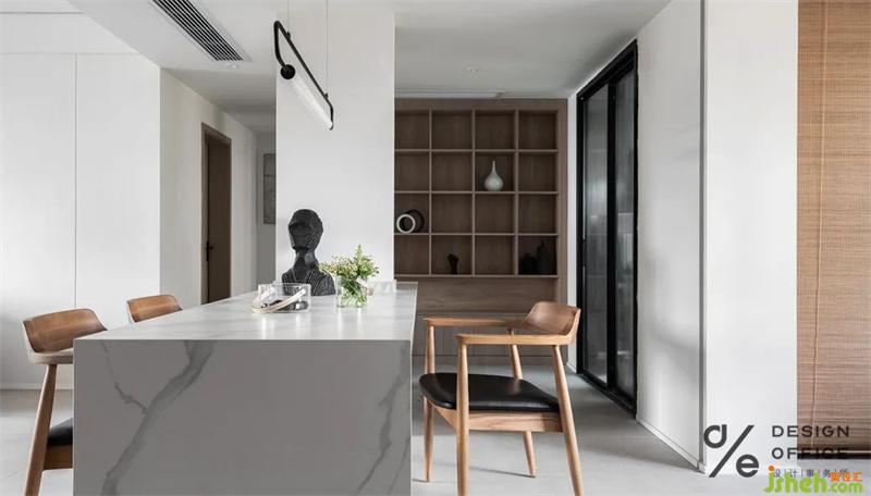 客餐廚連為一體,減少墻壁分隔帶來的封閉感,還能大大縮短家居動(dòng)線,為業(yè)主創(chuàng)造出一個(gè)慵懶從容的用餐空間。
