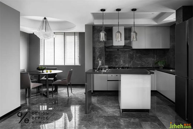 整體格局緊湊,廚房面積較??;拆除廚房墻體,根據(jù)業(yè)主要求做成開放式廚房;增設島臺,彌補操作臺的不足。
