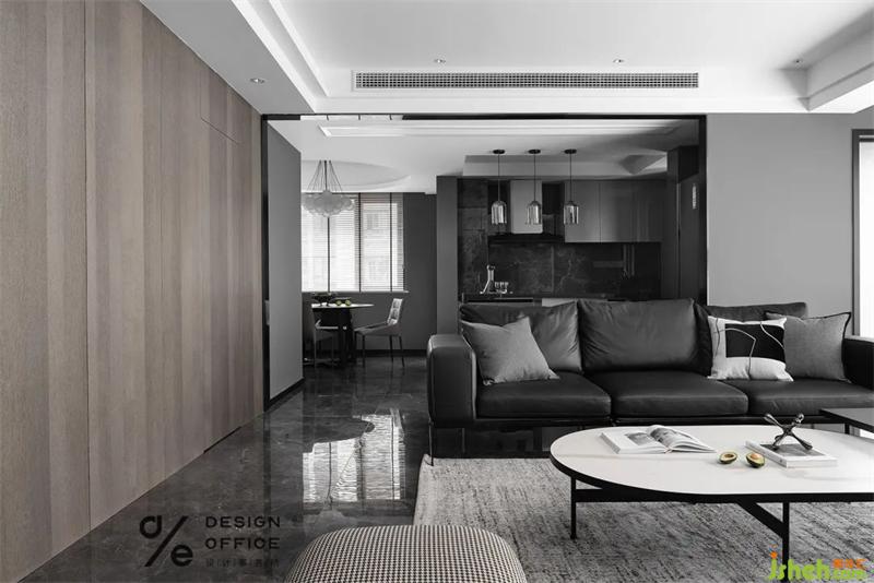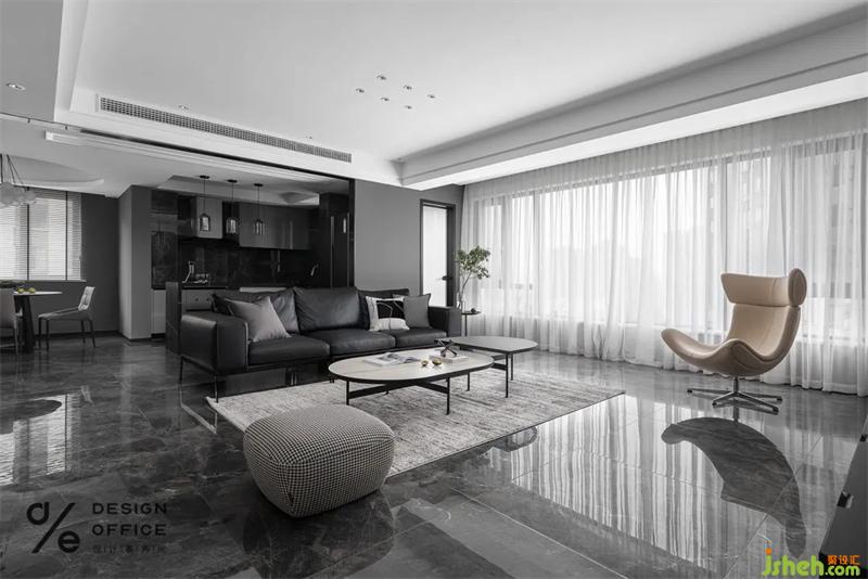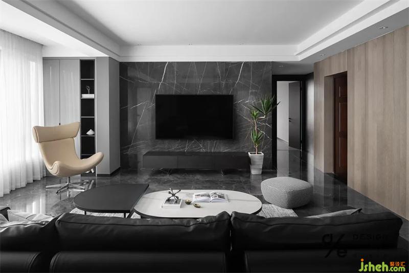 客廳采用無主燈照明,見光不見燈的設計是對于人最舒適的顧及;黑白的主色,是干凈純粹的色調;沒有過多的裝飾,只是將木色和灰色穿插在空間中。