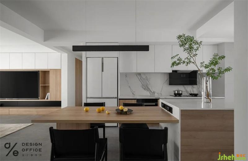 沒有做傳統(tǒng)的封閉式廚房,開放式的廚房增加社交屬性,同時還保留了獨(dú)立的生活陽臺。石材上墻,去掉了擋水線等不必要的處理,廚房顯得更干凈、整潔,也更方便清潔。