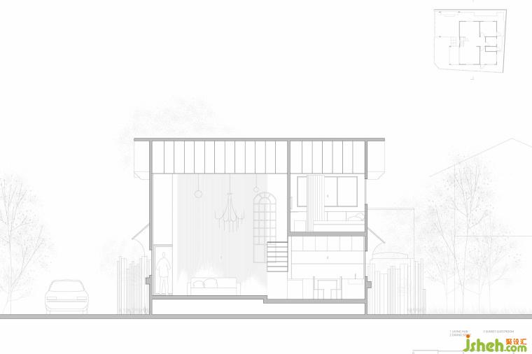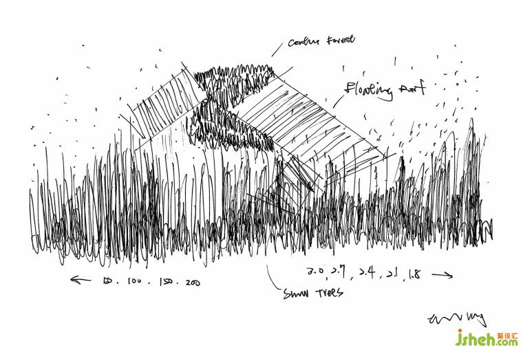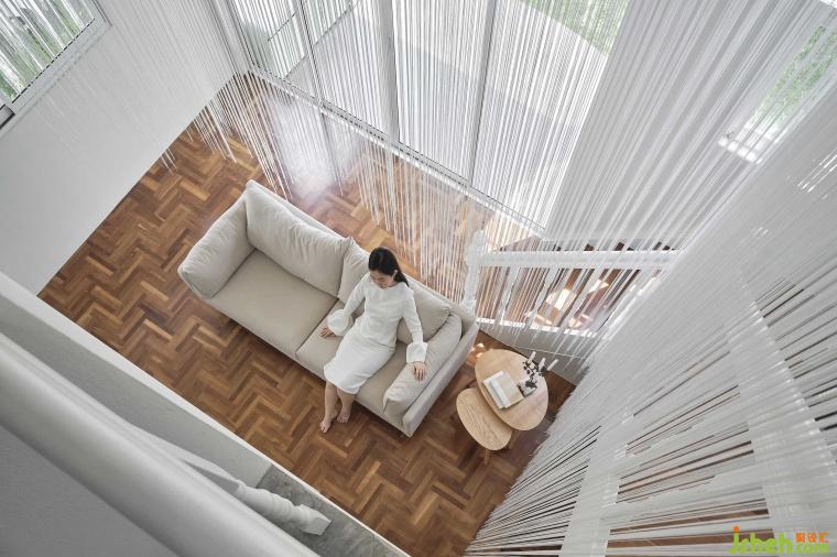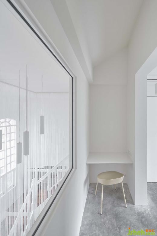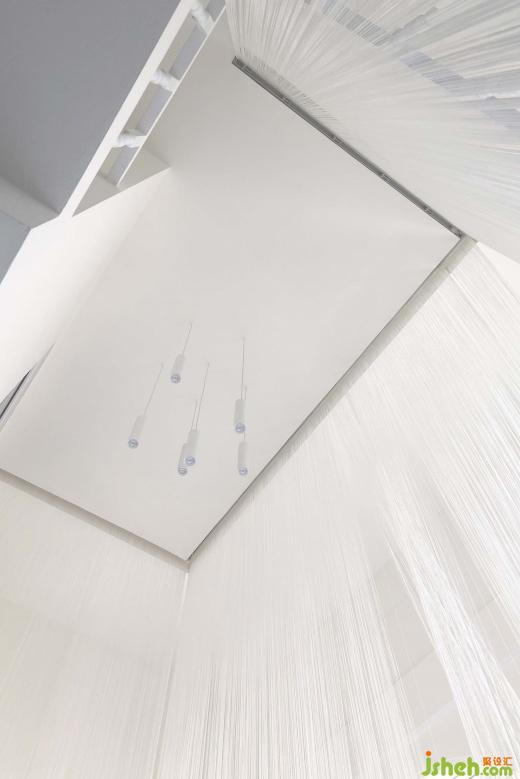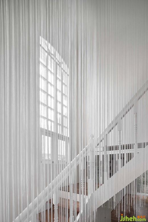當(dāng)進到內(nèi)部大廳空間,外部皺折且綿延不斷的穿孔鋁板,轉(zhuǎn)變成內(nèi)部輕柔且隨風(fēng)搖曳的線繩,巧妙連接內(nèi)外場所之間的過度,並在視覺上營造出有如自然雪花般的空間感知。近千根高低起伏的線繩,不僅在垂直向度串連起上下樓層,在水平向度更抽象的隔離與連接各個空間,其豐富又不確定性的造形效果也成為空間核心。
