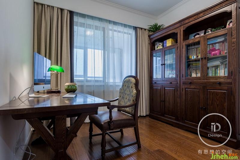 室內(nèi)設(shè)計師在書房選用了沉穩(wěn)的美式原木色,想營造安靜的空間環(huán)境,讓愛看書的男業(yè)主能夠靜下心來做自己的事情。