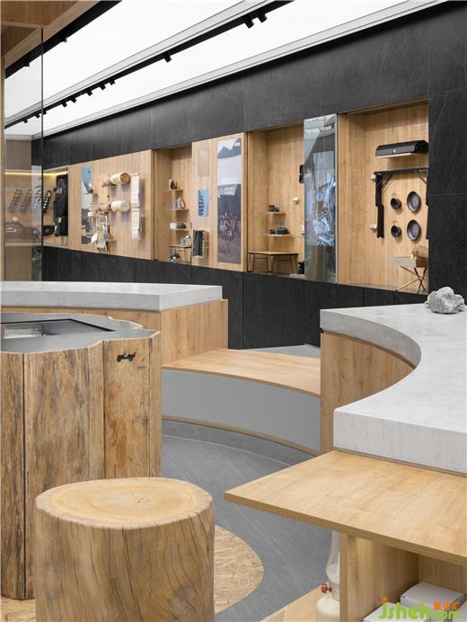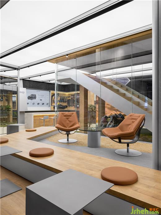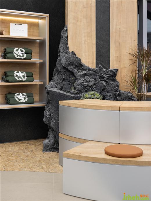 另一側(cè)區(qū)域的“外部”可作為舉辦品牌直播、跨界聯(lián)名活動(dòng)、VIP客戶體驗(yàn)沙龍的空間和舞臺(tái)。圍繞此多功能區(qū),INGROUP設(shè)置了多樣化的座位形態(tài),這樣的設(shè)計(jì)也使“內(nèi)部建筑”在末端有一個(gè)更加開放的立面景觀。