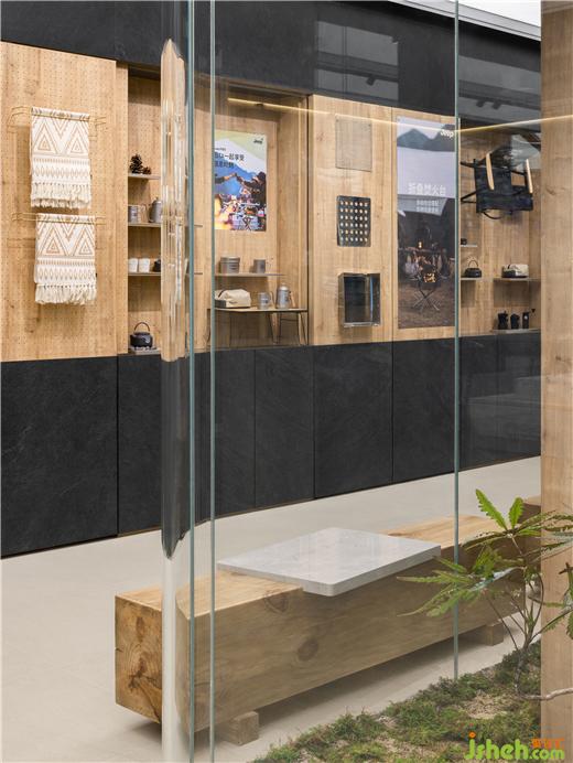 在環(huán)島展示臺(tái)后面設(shè)有通往空間二層的樓梯,樓梯下方空間形成了對(duì)自然外部的櫥窗化展示,地面的土壤、苔蘚和植物,與空間中人造的質(zhì)感形成了反差。透明玻璃幕墻使視線更通達(dá)的同時(shí),也和一側(cè)的框景有著材質(zhì)上的呼應(yīng)。