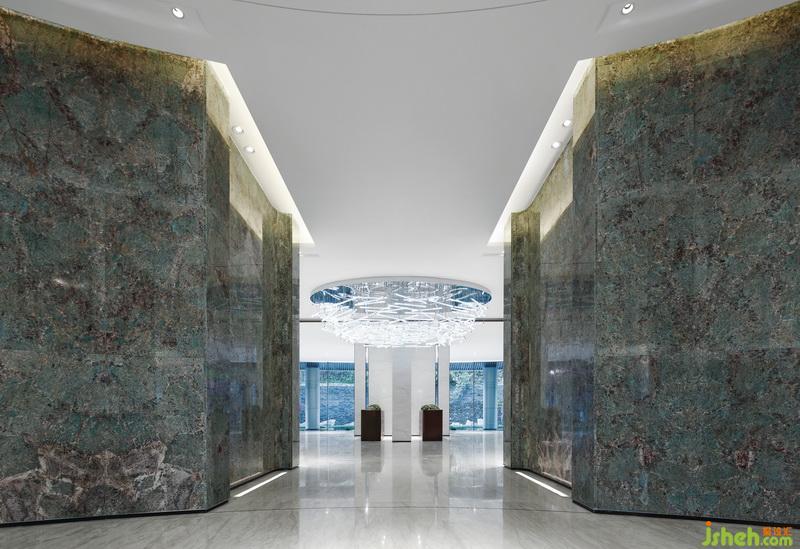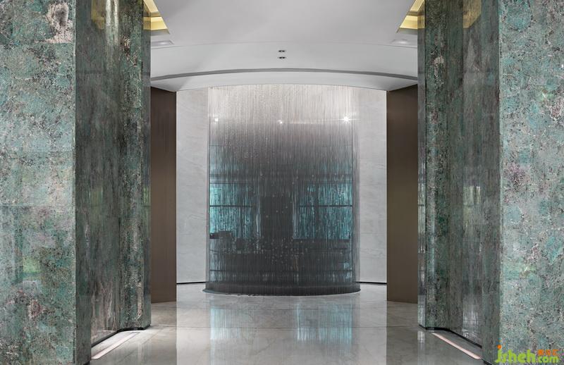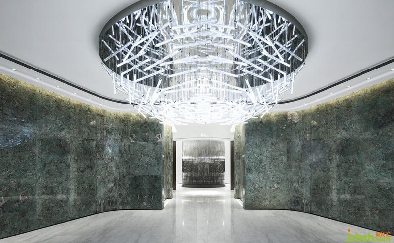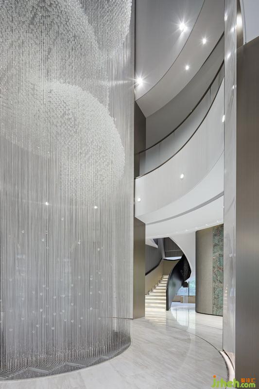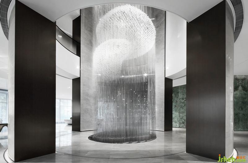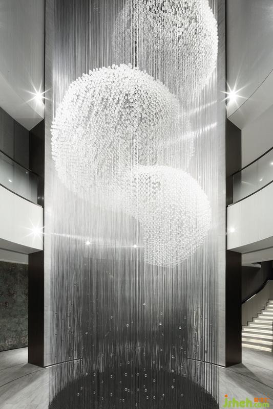 接待大廳的大型藝術(shù)裝置吊飾“銀河秩序”,直徑 3 米高 14 米,由近 7 萬顆光珠精心設(shè)計(jì)排序串聯(lián)而 成。一如白色的海浪、層層的云海、恢弘無邊的璀璨。