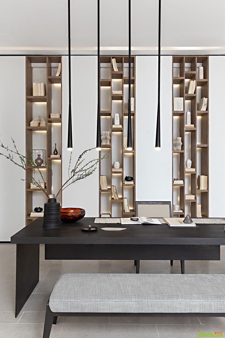 兼容宋代美學(xué)與現(xiàn)代主義的極簡(jiǎn)法則,鑒寶臺(tái)的設(shè)計(jì)以墨色與灰調(diào)、木色與素白描繪空間。內(nèi)嵌入墻的木制書(shū)架上隨意地陳列著陶瓷器具與舊書(shū),與素凈的雪柳、清透的碧石,共同勾勒出清雅恬淡的文人精神世界,豐盈而綿長(zhǎng)。