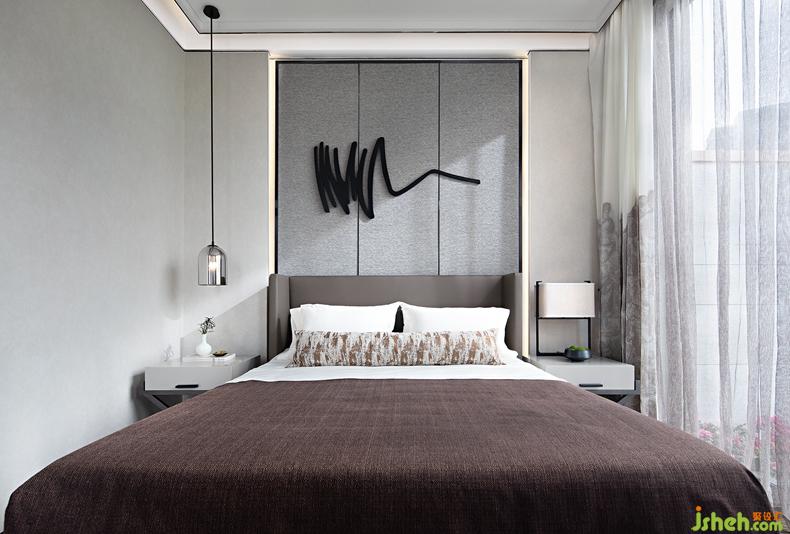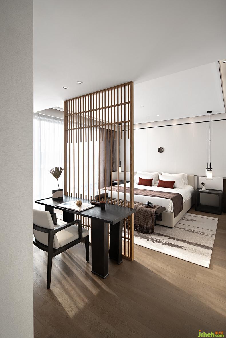 客房設(shè)計是婉約派詩詞的風(fēng)格,朱紅與素白相互映襯,山水的元素貫穿在室內(nèi)軟飾上,空間的氣韻清麗柔雅。背景墻的裝置是設(shè)計對東方語素的延展,筆墨的性格被極致地描繪出來,灑脫且隨性。