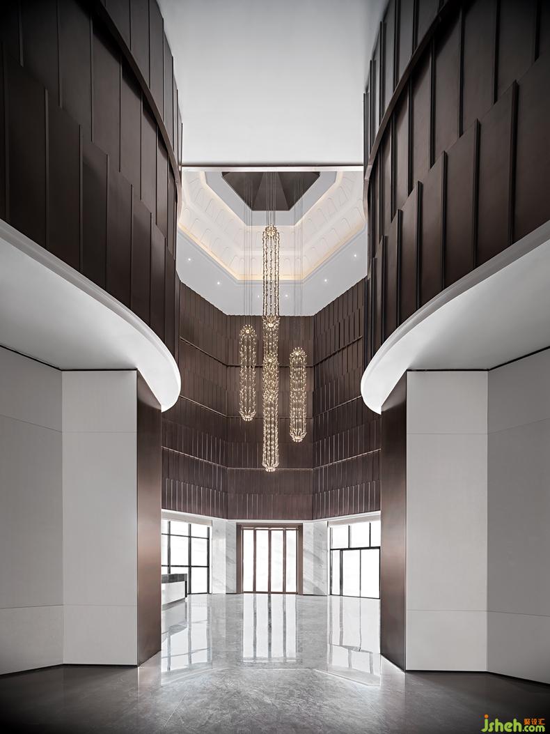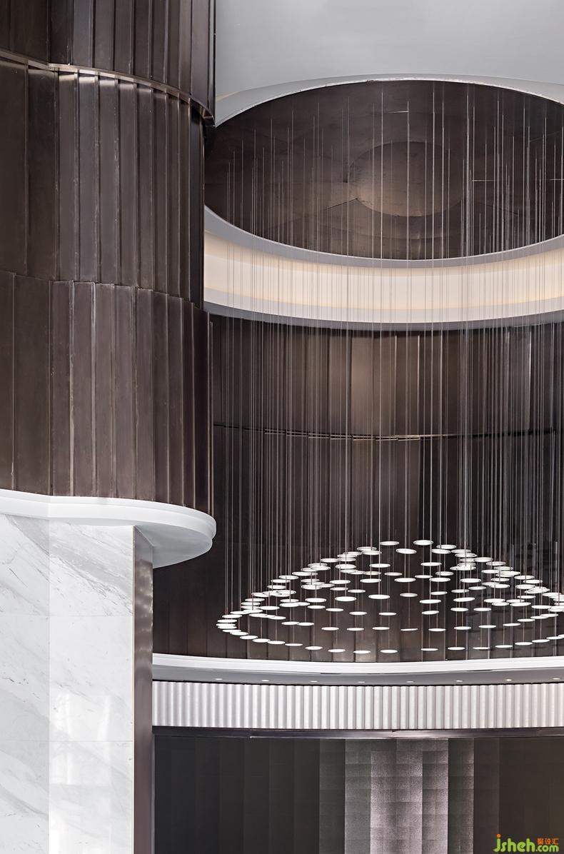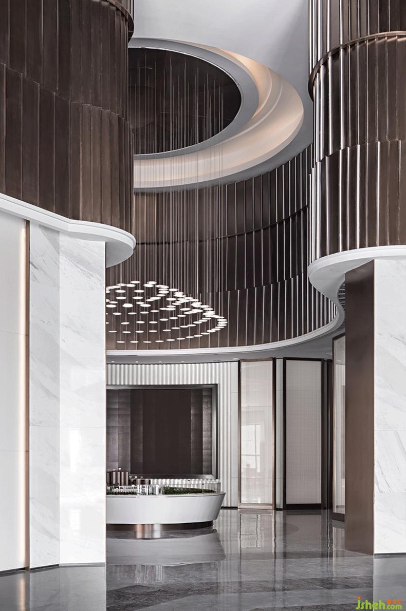 由于前廳處于圓頂建筑內(nèi)部,其層高16米帶來的空曠感需要適當(dāng)?shù)氖覂?nèi)表皮裝飾來調(diào)整舒適的視覺比例與空間尺度,帶來充裕感知上的磅礴氣勢(shì),整體空間本身不再屬于某種藝術(shù)風(fēng)格非此即彼的制式描述,而是通過材質(zhì)的流線造型與色彩的魅力結(jié)合,讓空間引人入勝。深圳裝修公司