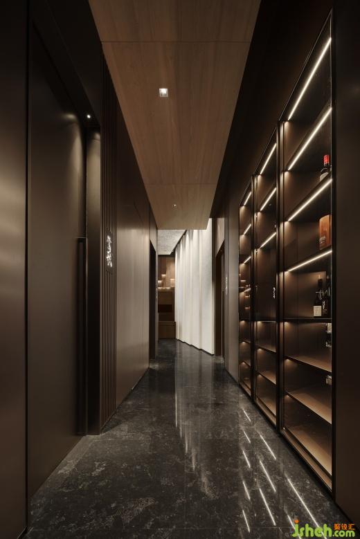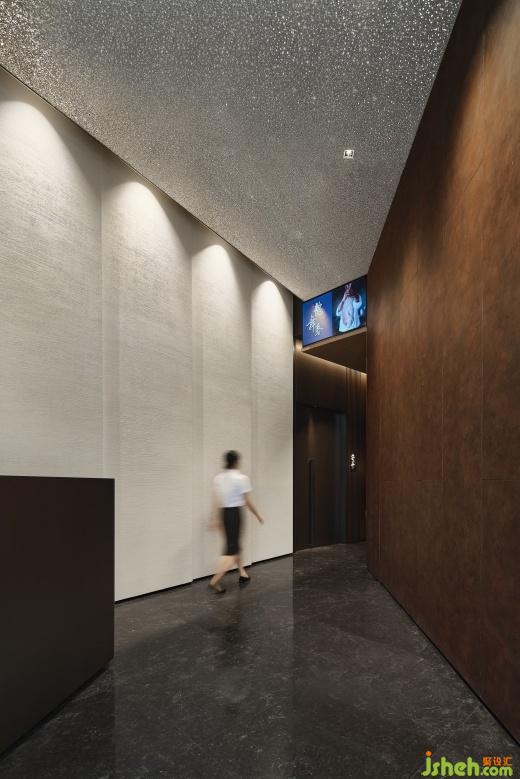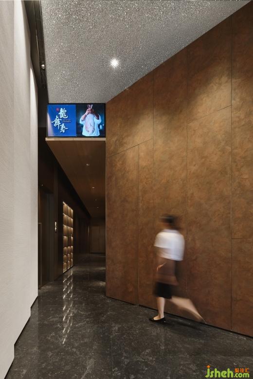 餐廳設(shè)計(jì)接待臺(tái)區(qū)域頂部燈光經(jīng)過泡沫鋁天花映射出點(diǎn)點(diǎn)星光閃爍,墻面柔性巖板曲折造型串聯(lián)狹長(zhǎng)走廊,利用朱顏鎏金板對(duì)比搭配,創(chuàng)造出一個(gè)恰當(dāng)且舒適的轉(zhuǎn)折性空間。