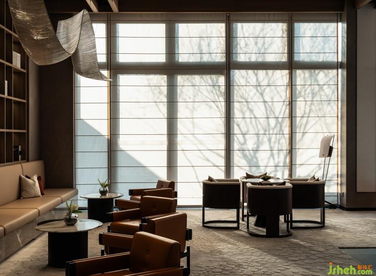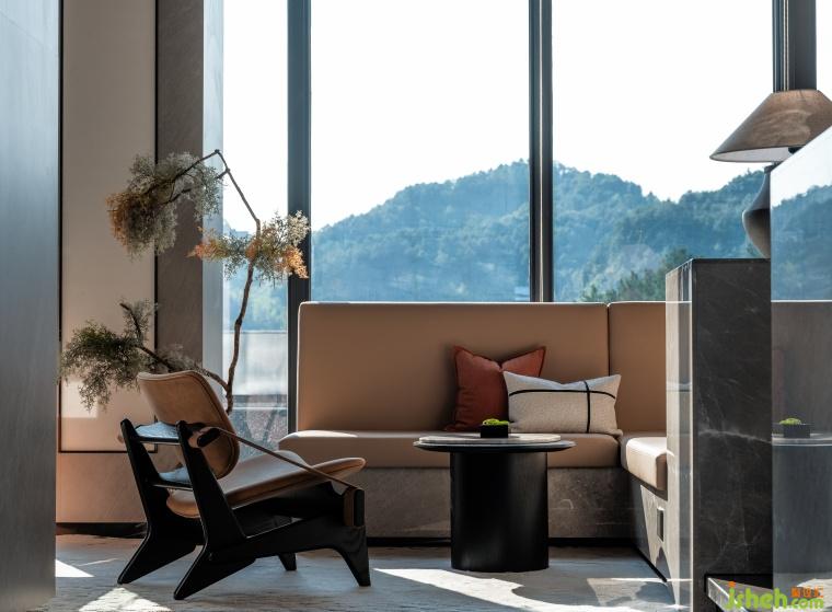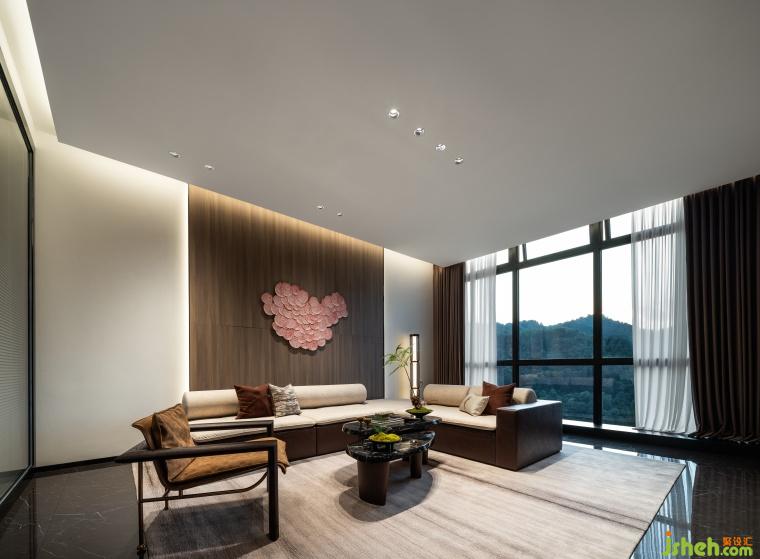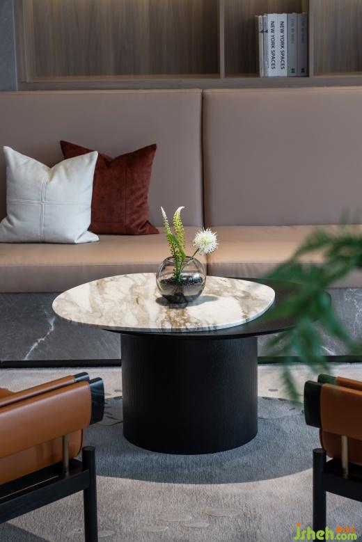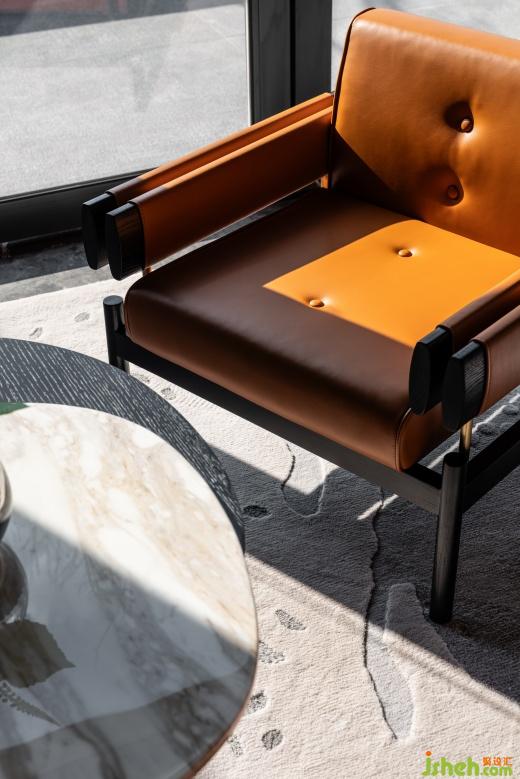 全景落地窗覆以淺咖色半透卷簾,打破方正帶來的拘束感,賦予洽談區(qū)溫情格調(diào)的藝術(shù)氣息。婆娑樹影,光暈漸進(jìn),色彩和元素肌理的映襯,是傳遞空間飽滿情緒的語匯。
