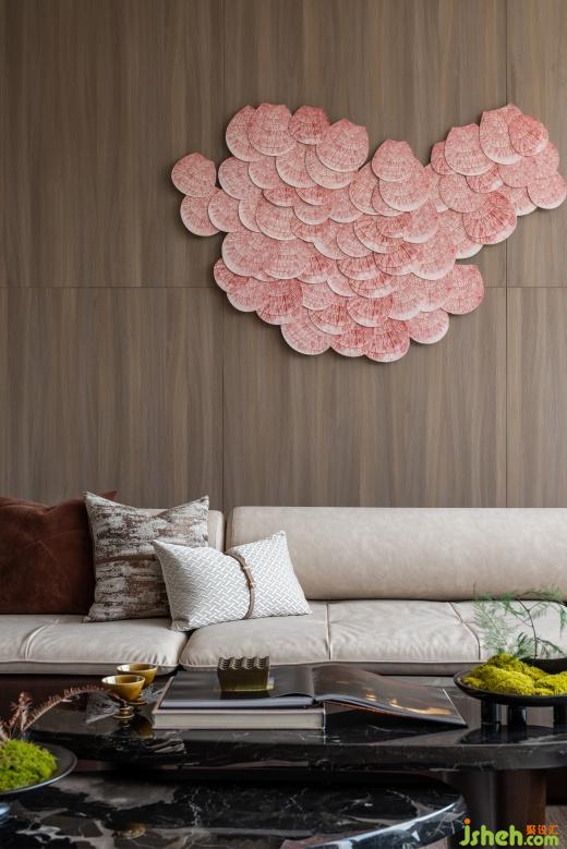 開放自由的藝術(shù)陳設(shè)源于對(duì)空間尺度與生活方式的雙經(jīng)驗(yàn)把控。從皮質(zhì)編制座椅、美式金屬立架,到蝕刻金屬藝術(shù)品,空間的價(jià)值得以豐盈;通過節(jié)奏把控,MOK最大限度規(guī)劃家具的配比,保留客廳區(qū)間社交視線的穿透感,又能讓人明顯感受到人文與藝術(shù)、通透與流動(dòng)。