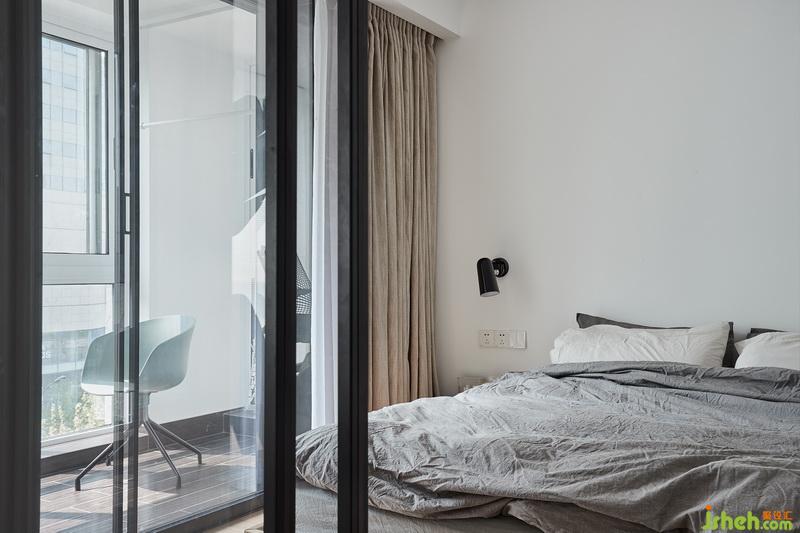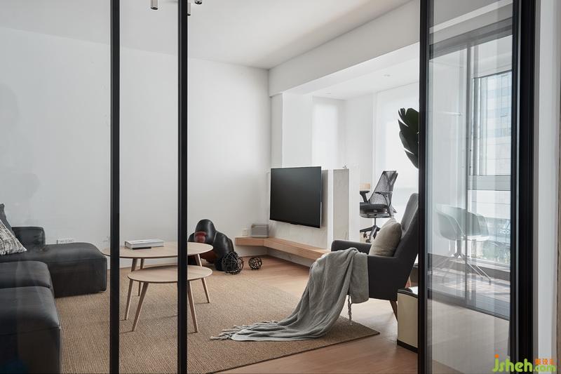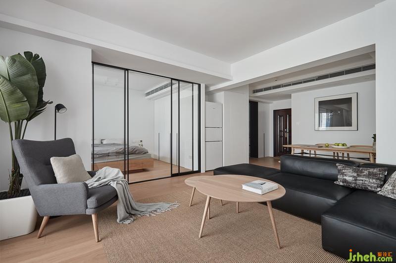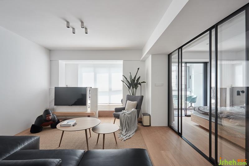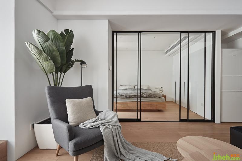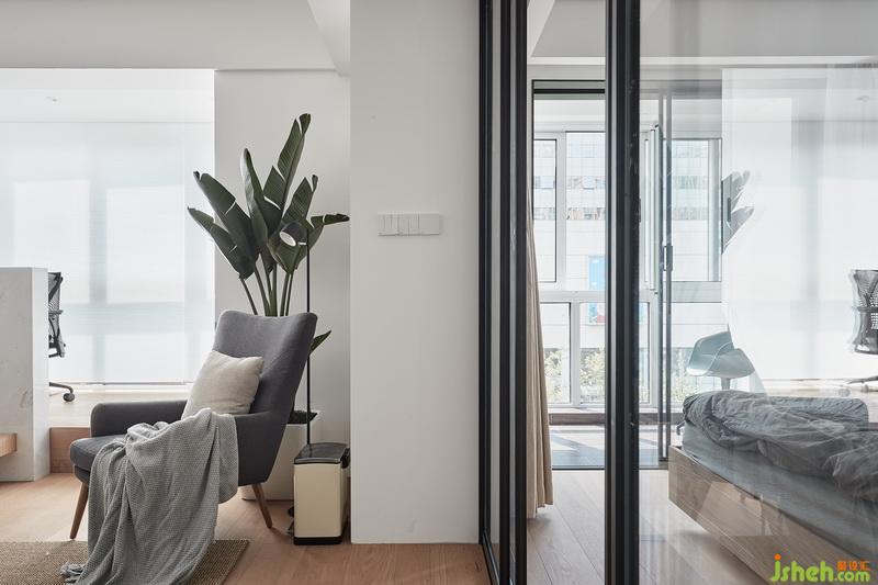 這是位于杭州城西的一所小戶型住宅。室內(nèi)設(shè)計(jì)師在與業(yè)主溝通后,了解到業(yè)主對于生活的理解正好與“Less is more”相一致,于是我們在滿足業(yè)主對于房屋的基本需求后,我們開始做減法,主臥與客餐廳區(qū)域室內(nèi)設(shè)計(jì)師利用玻璃移門形成通透的空間,相互貫穿,將空間模糊化,從而在視野上削弱了小戶型帶來的局促感。