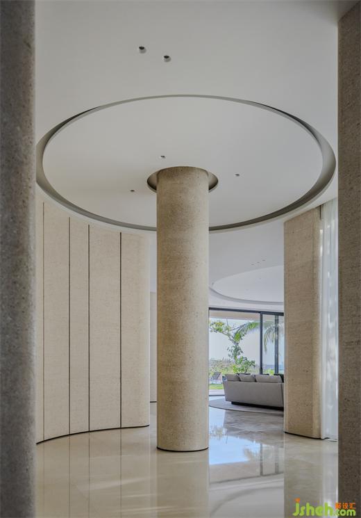 將柱子作為中心,別墅裝飾以水滴與漣漪進(jìn)行天花弧形擴(kuò)散的形式,從而形成視覺(jué)焦點(diǎn)在空間的表達(dá)邏輯。就像水滴落入水面時(shí)產(chǎn)生的漣漪一樣,這種設(shè)計(jì)不僅將視線引導(dǎo)到空間的中心,還能夠在整個(gè)空間中營(yíng)造出一種流動(dòng)的美感,增強(qiáng)人們的空間體驗(yàn)。
