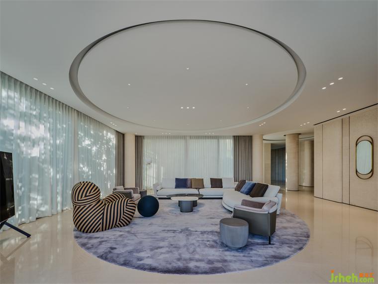 溫潤(rùn)的大地色系透露著恬淡的熨帖與靜謐的暖意,搭配線條與幾何結(jié)構(gòu)延伸活力的流線,簡(jiǎn)潔的語(yǔ)匯給人柔和的熟悉感,圓角牆線形塑出流淌躍動(dòng)的空間,圓形天花的中心圍合營(yíng)造出舒適和親密的氛圍。它將人們聚焦在客廳的中心??蛷d的家具和布置與圓形天花相呼應(yīng),進(jìn)一步強(qiáng)調(diào)中心圍合的感受。這種設(shè)計(jì)邏輯不僅為空間增添了獨(dú)特的美感,還為人們提供了一個(gè)溫馨而聚集的空間,促進(jìn)了家人和朋友之間的交流和互動(dòng)。