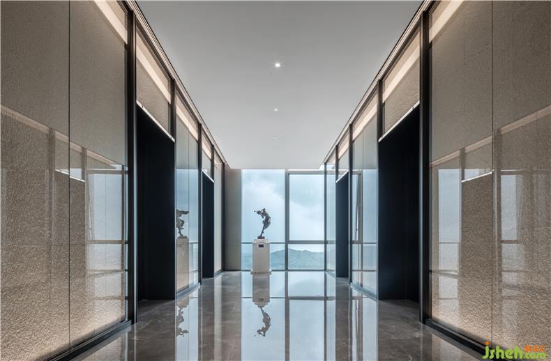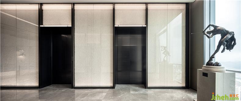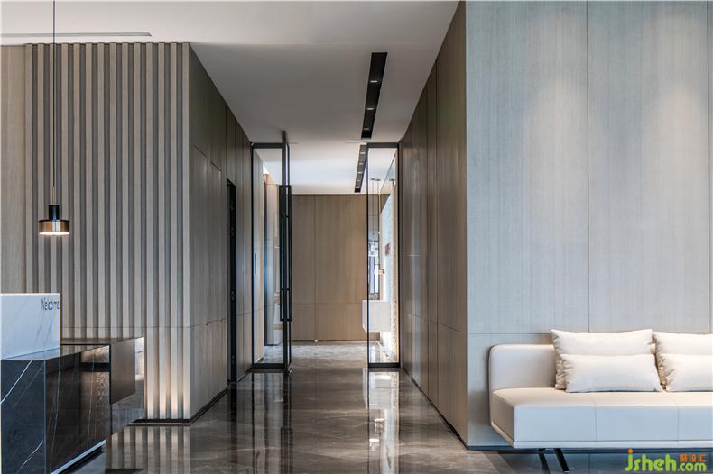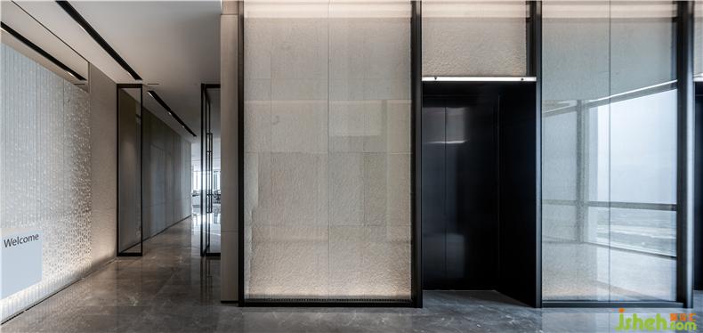 電梯廳作為空間的連接體,它在集合造型中充當(dāng)空間元素的中介和摩擦。辦公室設(shè)計(jì)在材料的設(shè)計(jì)上,我們將細(xì)拉槽石材/玻璃進(jìn)行碰撞,體現(xiàn)材料本身的張力,集合燈光的重要性去展現(xiàn)科技感的通道。