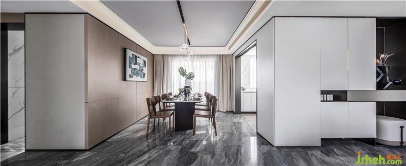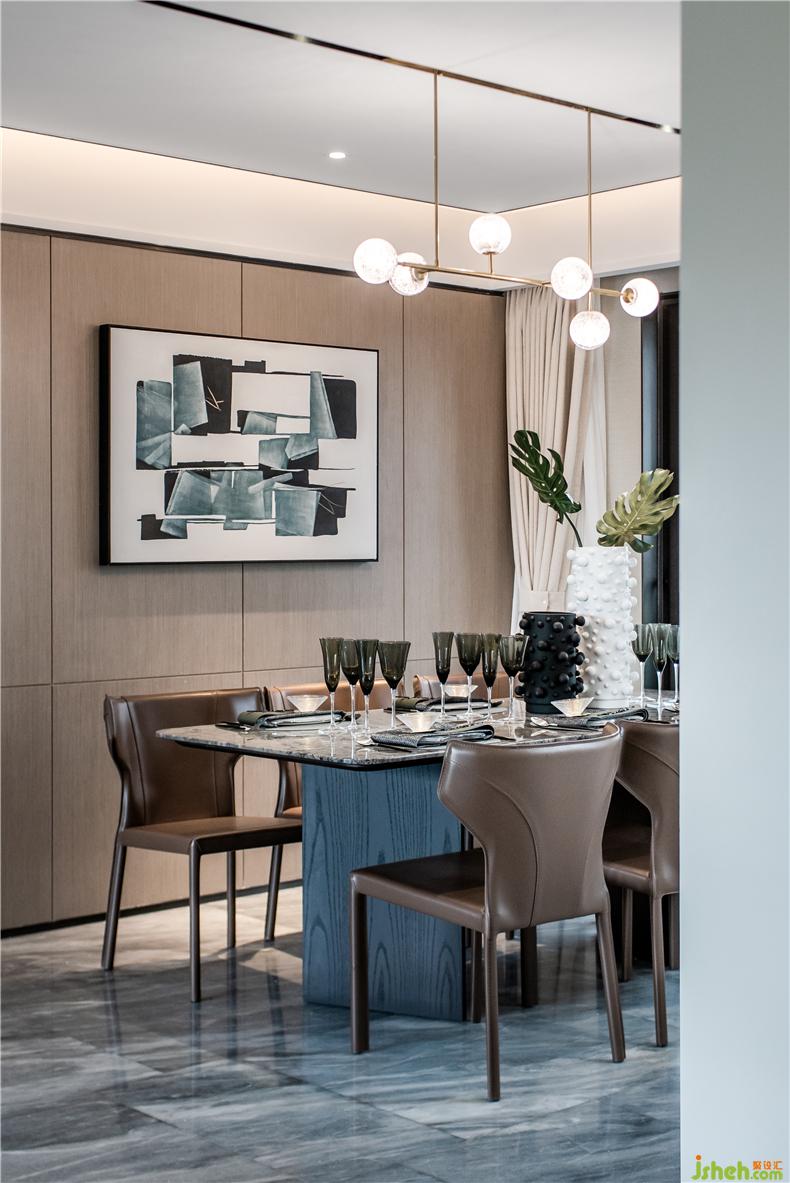 開放式式餐廳與廚房的巧妙連接,讓空間變得更靈動。樣板房設(shè)計大理石材質(zhì)的餐桌帶來的質(zhì)感與皮質(zhì)餐椅,形成一剛一柔的對比與碰撞
