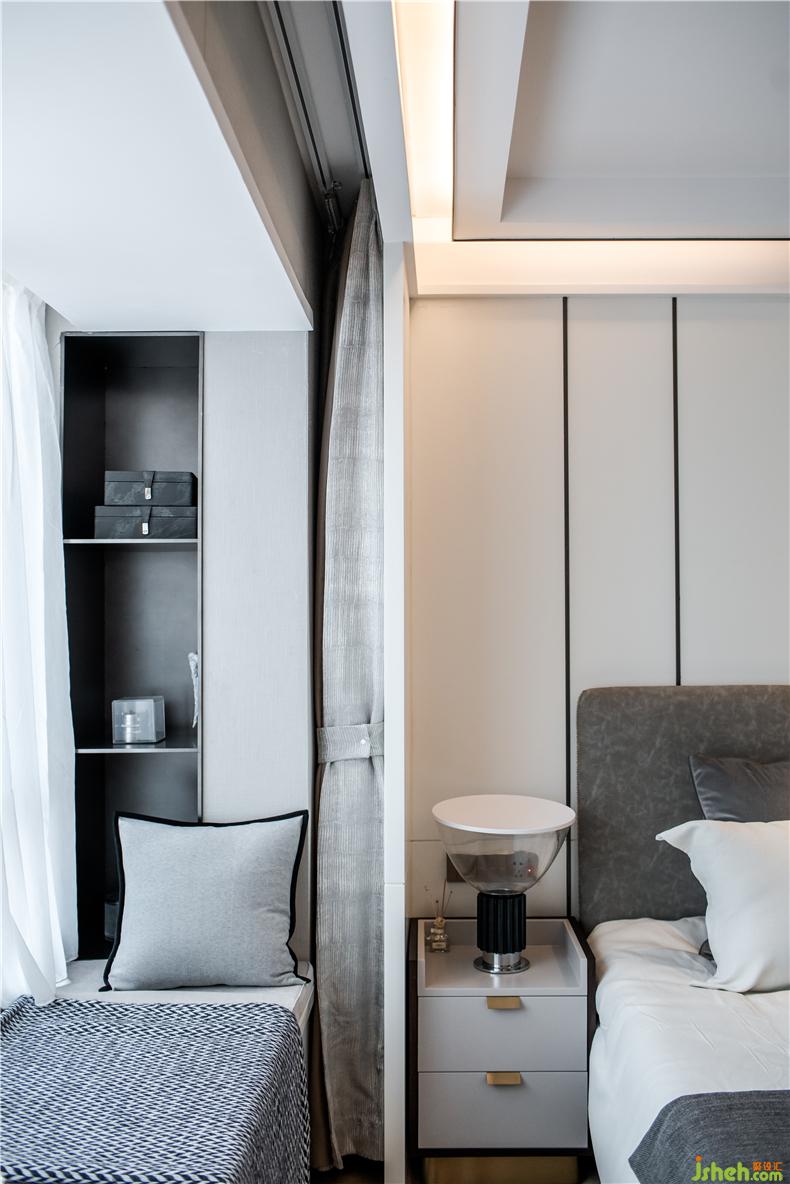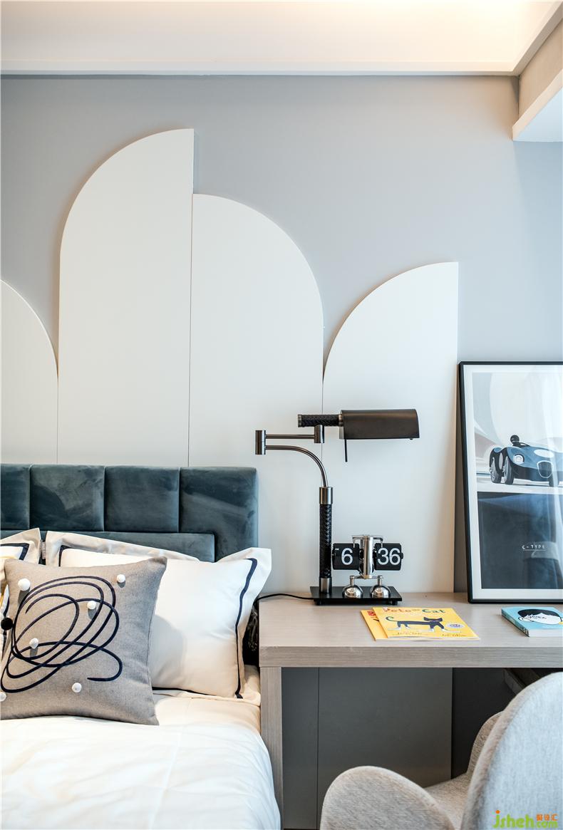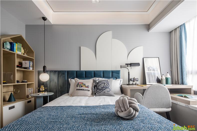 空間色彩簡(jiǎn)潔明快,白色統(tǒng)領(lǐng)了房間的主體色,樣板房設(shè)計(jì)微微的藍(lán)色成了房中驚鴻一瞥的點(diǎn)綴。