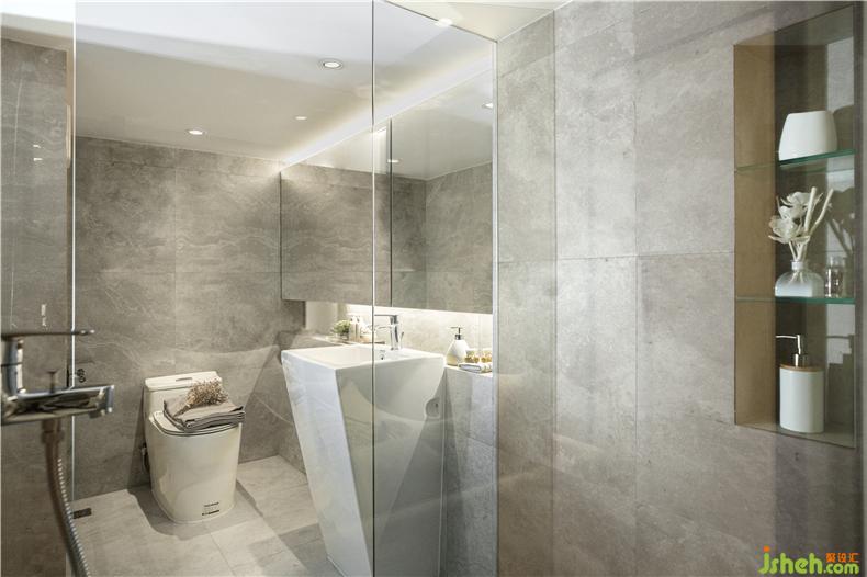浴室的設(shè)計(jì)簡(jiǎn)潔現(xiàn)代,置物槽和洗手臺(tái)的設(shè)計(jì)、干濕分離的處理等在細(xì)節(jié)上做的非常貼心,樣板房設(shè)計(jì)達(dá)到了藝術(shù)美感和生活氣息的平衡。統(tǒng)一的灰色瓷磚和通透玻璃,使得衛(wèi)生間干凈舒服