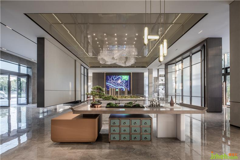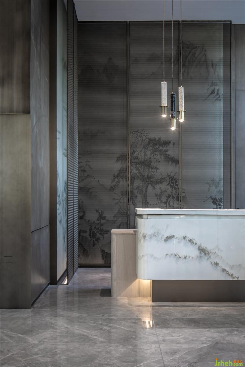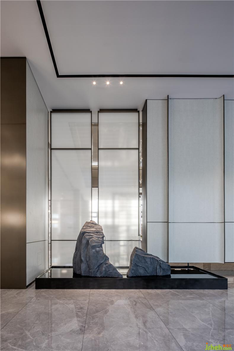 “山自在,水如來”,雕塑拋光切割模壓玻璃和巖板材料來體現(xiàn)我們與世界的關(guān)系,從而有可能掌握我們的內(nèi)在性,突出實(shí)現(xiàn)所穿過而看不到的巨大整體,從而使自己和自己之間存在的事物變得簡單而直接。裝修設(shè)計(jì)門廳用素色的色調(diào)和干凈利落的線條,表現(xiàn)一種由古典美和現(xiàn)代美相互融合的溫柔力量,凈化著每個(gè)所到之人的浮躁心靈