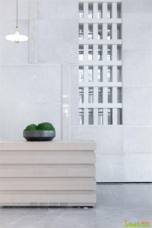 入口空間中,運(yùn)用構(gòu)成的手法進(jìn)行墻體體塊的穿插,通過設(shè)計(jì)的轉(zhuǎn)譯,構(gòu)建空間的意境,實(shí)現(xiàn)心靈的回歸。簡(jiǎn)潔靈動(dòng)的線條和明朗干凈的氣質(zhì)交織,匯合凝聚著一股自然親和的力量,整個(gè)空間親疏有度,仿佛是會(huì)呼吸。