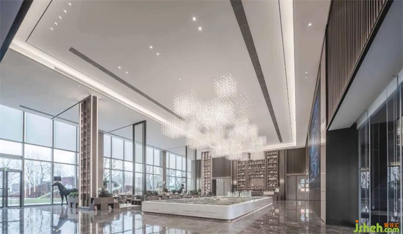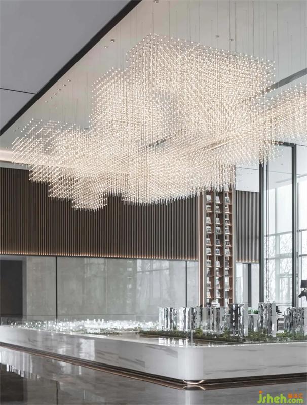 金屬線條穿插、交疊,形成立體的網(wǎng)格狀吊燈,將數(shù)學的理性嚴謹美具象化。遠看云霧般的鏤空設計將視覺引向更遠方,呈現(xiàn)出“山色入城秋”的美感,也暗承西安古城的歷史文化淵源。