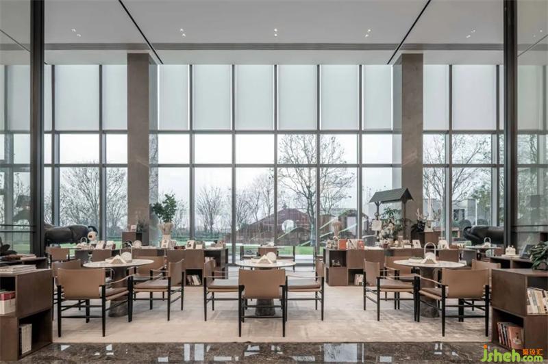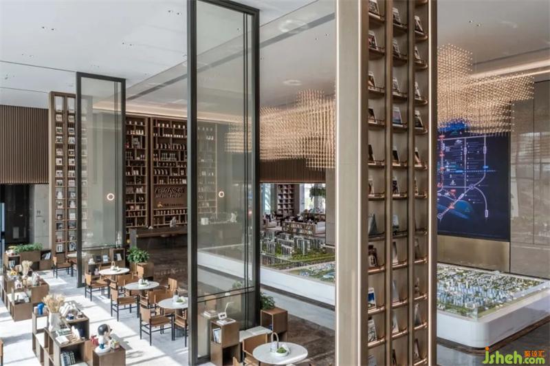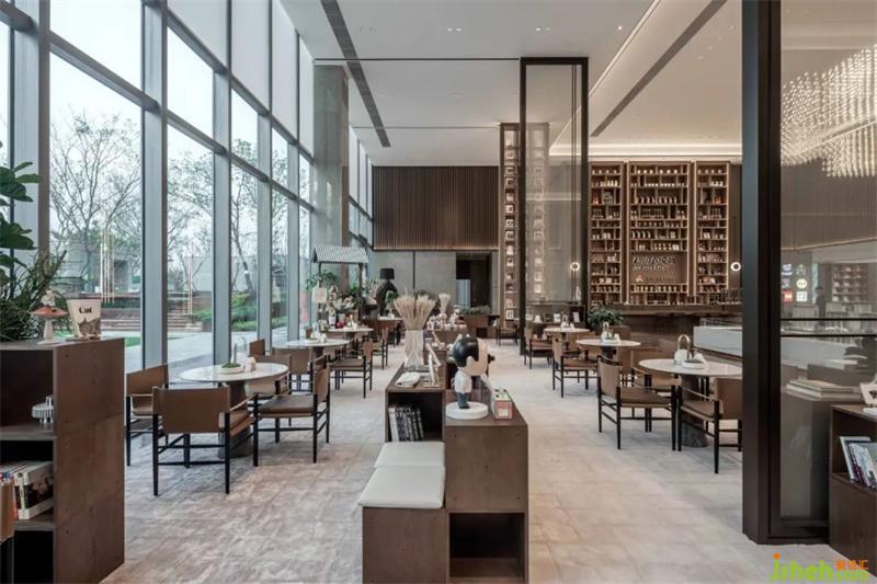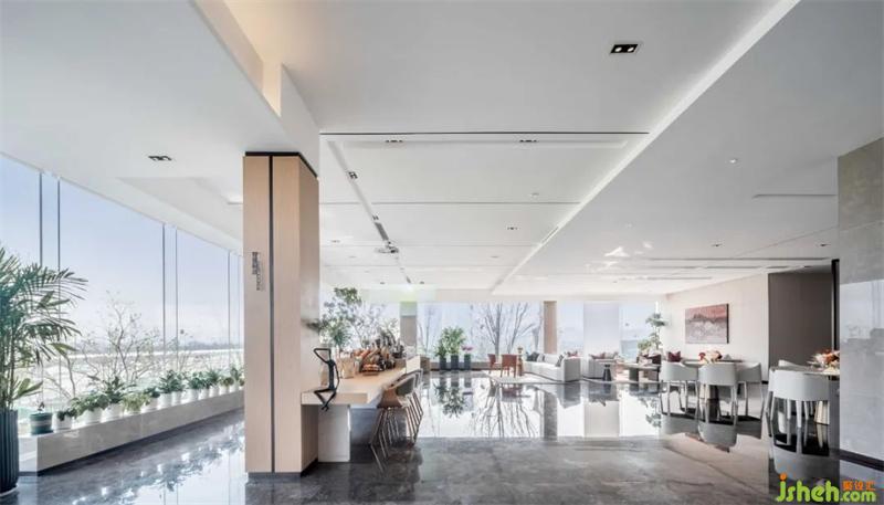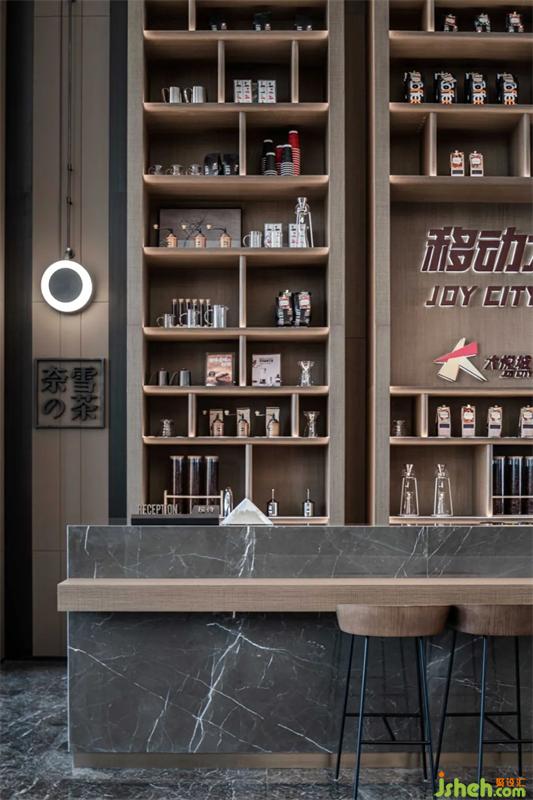 水吧區(qū)渾厚的木飾面板在墻面上縱橫,簡約的線條與面描摹出現(xiàn)代空間的藝術感。售樓處設計木飾面的溫暖細膩與銀河灰石材的冷靜理性互相存托互相成就,整個空間秩序井然大氣得體。