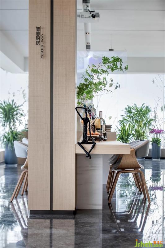 智慧廚房置于明亮之中,自然木色和黑色藝術品頗具雅趣。植物的加入,生氣了整個空間,禮貌而不過分熱絡的與來訪者產(chǎn)生舒服的聯(lián)系。