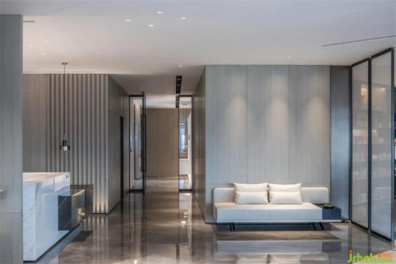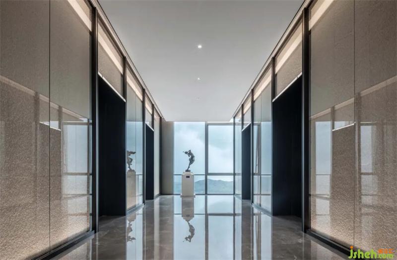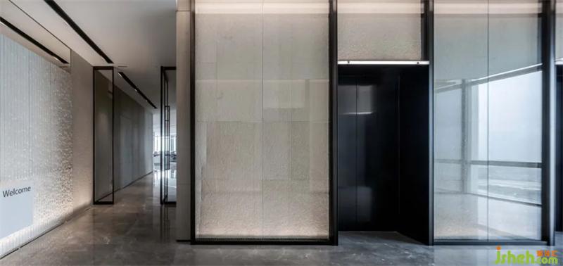 電梯廳作為空間的連接體,它在集合造型中充當(dāng)空間元素的中介和摩擦。在材料的設(shè)計上,我們將細(xì)拉槽石材/玻璃進(jìn)行碰撞,體現(xiàn)材料本身的張力,集合燈光的重要性去展現(xiàn)科技感的通道。