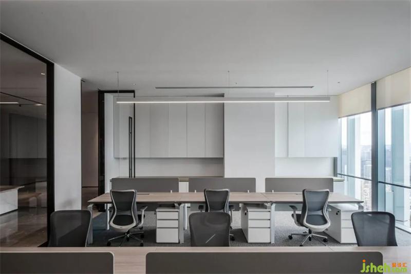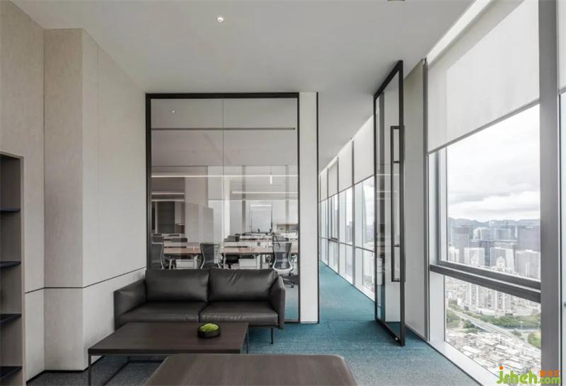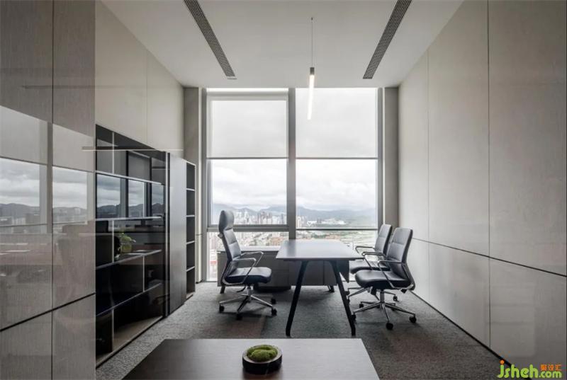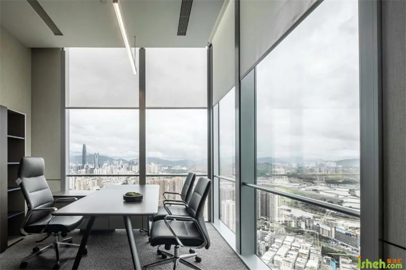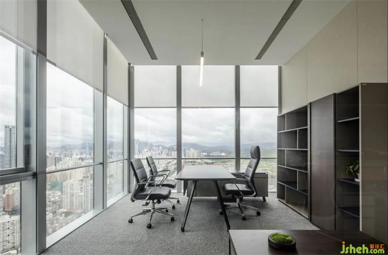 董事長(zhǎng)辦公室大面積的玻璃窗將外景引進(jìn),深圳的日與夜變成室內(nèi)一幕,俯覽這座城,將城市之景盡收眼底。淡藍(lán)色地毯從開放式辦公室延伸至里,在空間里創(chuàng)建了一個(gè)“邊界”,而地毯可以容納人的“之間”結(jié)合在一起。