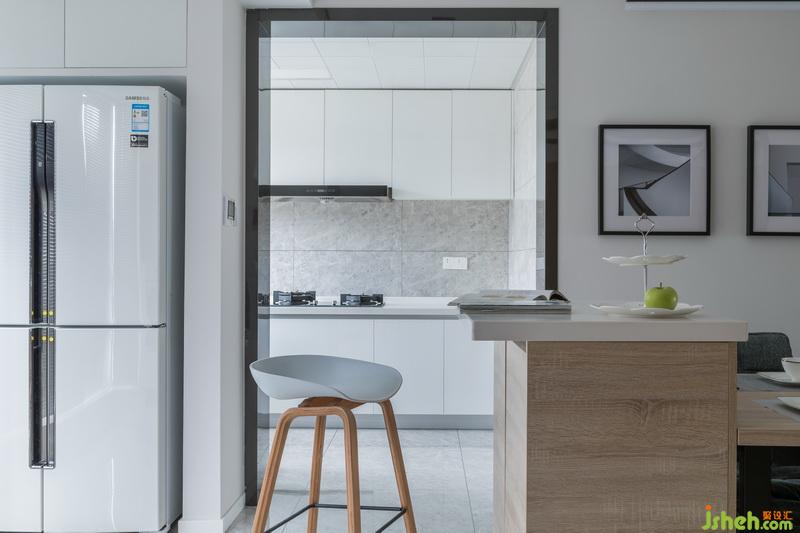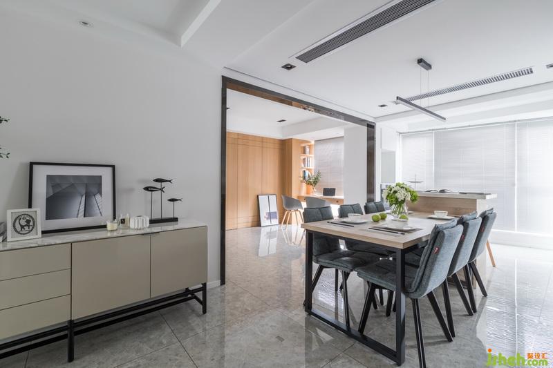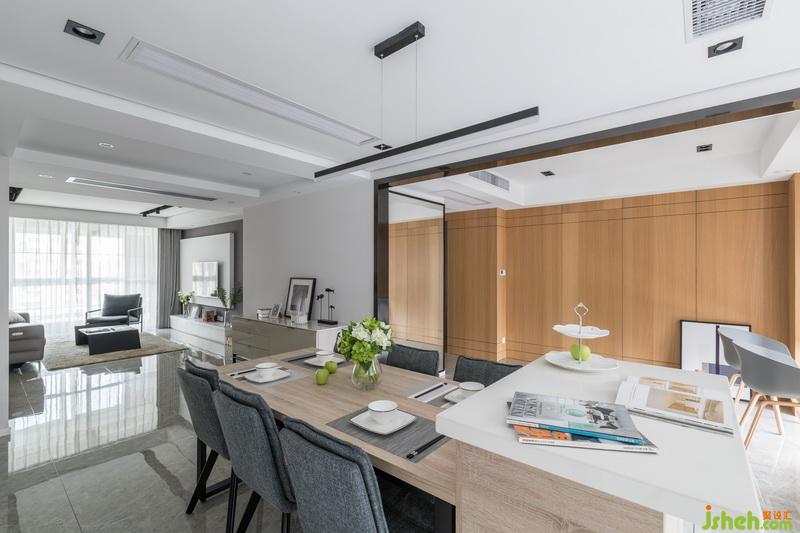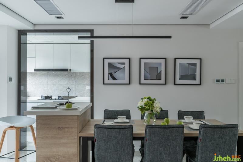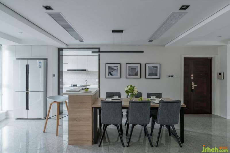 設(shè)計(jì)公司利用島臺(tái)加餐桌的形式,使得餐廳區(qū)域?qū)挸ㄔS多,餐椅選擇棉麻的材質(zhì),搭配木質(zhì)的臺(tái)面,彰顯出柔和內(nèi)斂的空間特性。