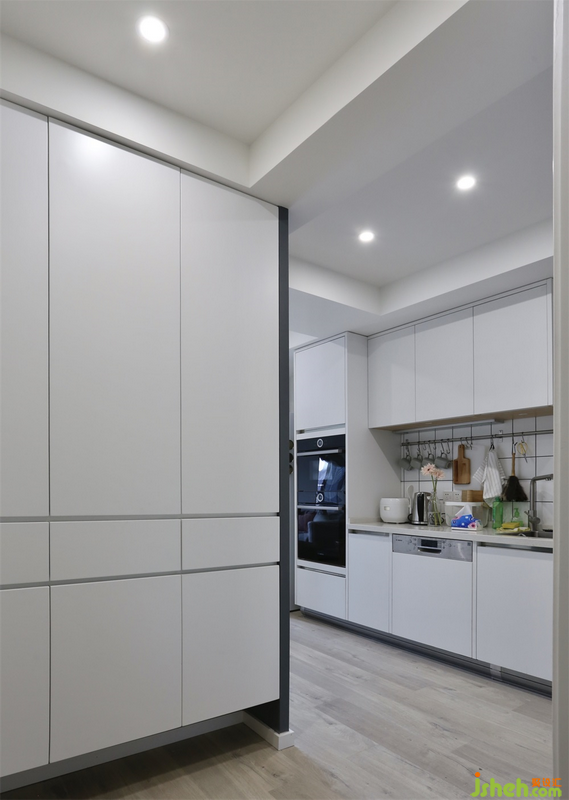 廚房整個(gè)臺(tái)面延伸到了餐廳區(qū)域,吊柜下方預(yù)留設(shè)計(jì)了燈光條。