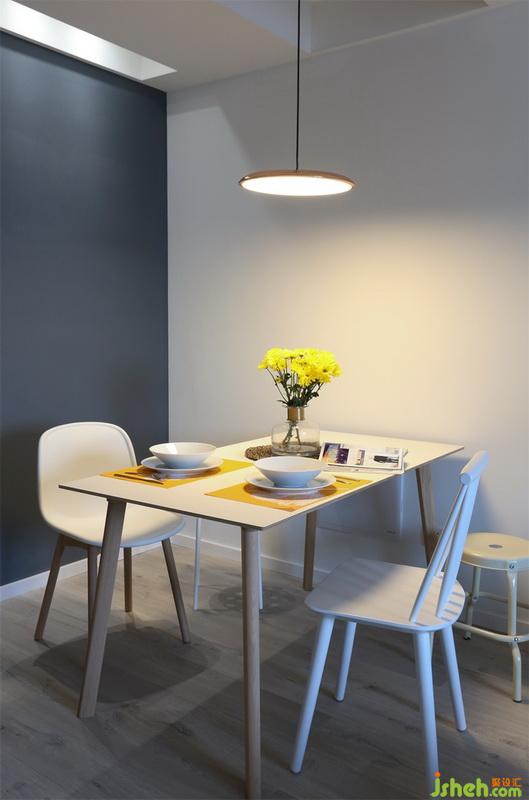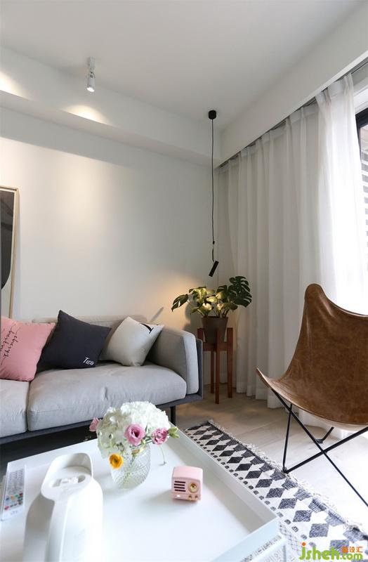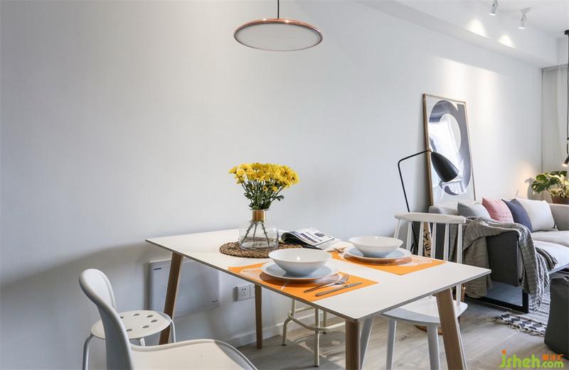 整個(gè)客餐廳沒有多余的吊頂,室內(nèi)設(shè)計(jì)師使用了明裝的射燈照亮沙發(fā)背景。沙發(fā)角落加了一盞小吊燈,讓空落落的角落也變得生動(dòng)起來。