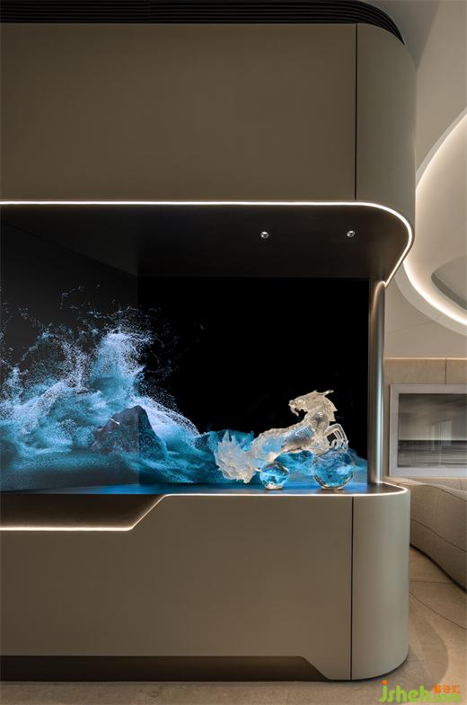 與多媒體屏幕結合,海藍色的流動水紋演繹鹿島居所的“山海經(jīng)”,作為空間的和唱者,麒麟御水而行,動靜之間散發(fā)神性。
